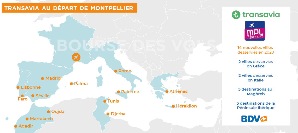 En 2020, la compagnie aérienne Transavia exploitera deux Boeing 737-800 qui assureront des vols directs au départ de l'aéroport de Montpellier vers une quinzaine de destinations saisonnières. Les vols au départ de l'aéroport de Montpellier auront pour destination Faro, Lisbonne, Madrid, Palma de Majorque, Séville, Athènes, Héraklion, Palerme, Rome, Agadir, Marrakech, Oujda, Djerba et Tunis.